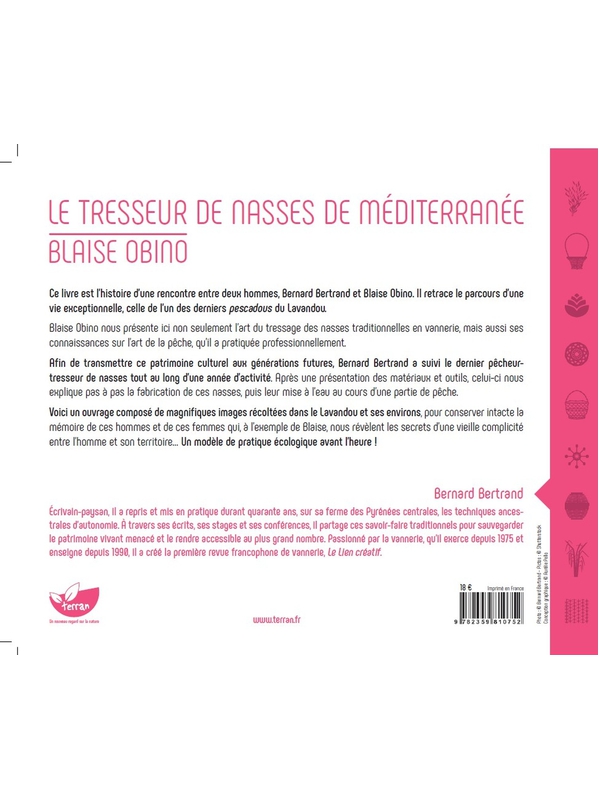 Ce livre est l'histoire d'une rencontre entre deux hommes, Bernard Bertrand et Blaise Obino. Il retrace le parcours d'une vie exceptionnelle, celle de l'un des derniers pescadous du Lavandou. Ce vannier, ancien pêcheur professionnel, s'est passionné pour la pêche traditionnelle en Méditerranée avec des nasses nappes (vannerie à nappes cousues). Il nous transmet non seulement ses connaissances sur l'art de la pêche des poissons et crustacés, mais aussi l'art du tressage des nasses. Afin de transmettre ce patrimoine culturel aux générations futures, l'auteur accompagne le dernier pêcheur tresseur de nasses tout au long d'une année d'activité. Après une présentation des matériaux et outils nécessaires à cette technique spécifique, il nous explique pas à pas la fabrication des nasses, puis leur mise à l'eau au cours d'une sortie de pêche. Cet ouvrage est composé de magnifiques images récoltées dans le Lavandou. Il veut conserver intacte la mémoire de ces hommes et de ces femmes qui, à l'exemple de Blaise, nous transmettent les secrets d'une vieille complicité entre l'homme et son territoire… Un modèle de pratiques écologiques avant l'heure !Bertrand Bernard Voir moins