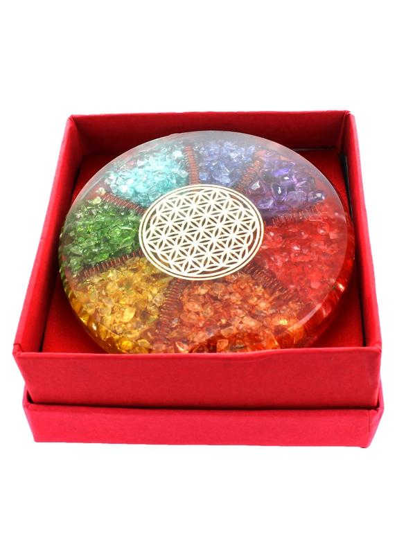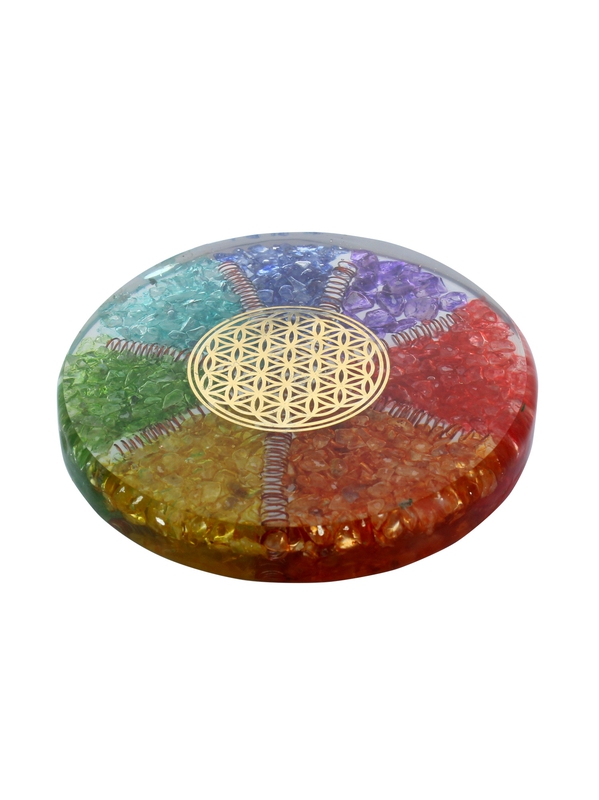 Sous verre Orgonite 7 Chakras et Fleur de Vie en métal. L'Orgonite est un assemblage de pierres semi-précieuses, de résine et de particules de métal. Elle est connue pour lutter contre les pollutions électromagnétiques mais aussi pour augmenter le taux vibratoire d'un lieu ou d'une personne. Elle ac Voir plus