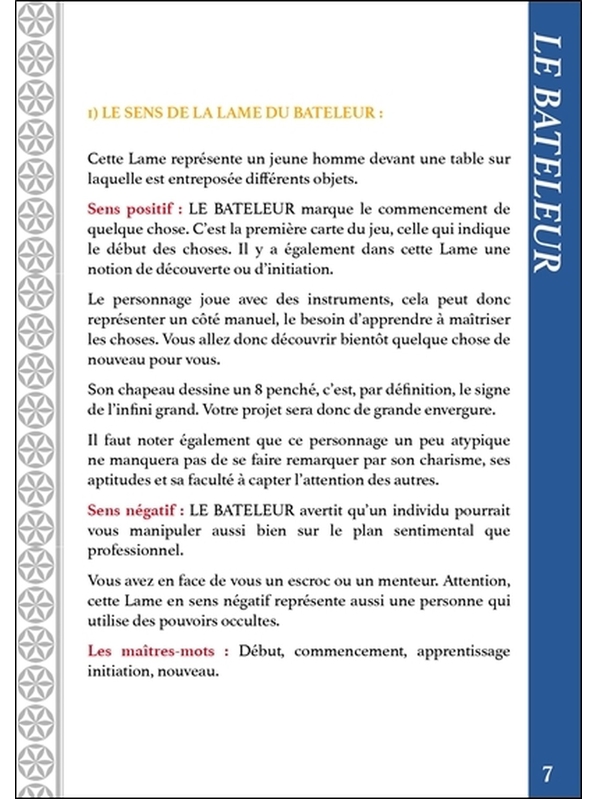 Ce petit livre est le complément idéal pour celui qui vient d'acquérir ou acquiert un tarot de Marseille. Il éclaire le lecteur sur le sens profond des arcanes majeurs et montre comment procéder à des tirages. Avec ce livre, il est très vite possible de faire des séances de divination et d'obtenir d
