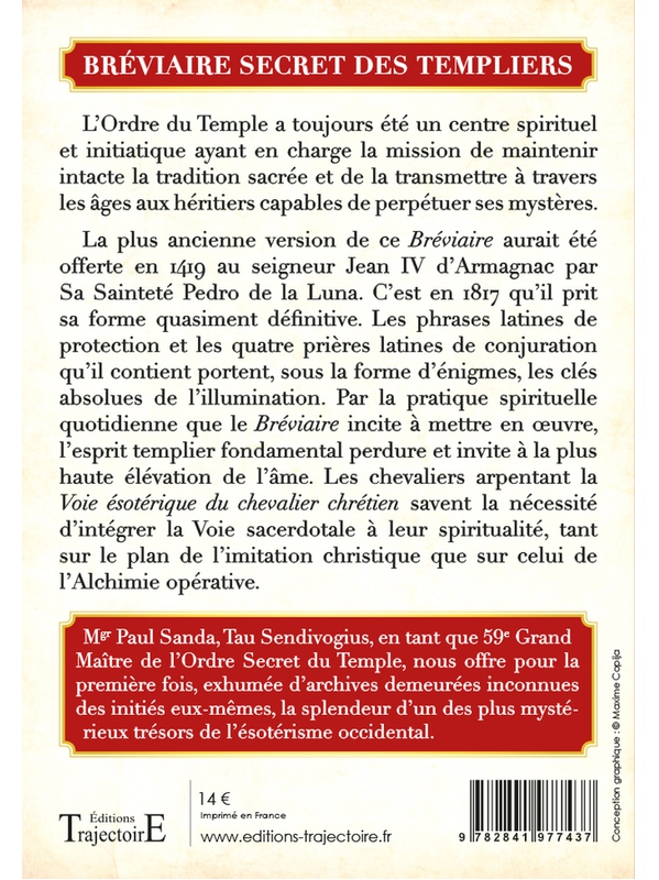 L’Ordre du Temple a toujours été un centre spirituel et initiatique ayant en charge la mission de maintenir intacte la tradition sacrée et de la transmettre à travers les âges aux héritiers capables de perpétuer ses mystères. La plus ancienne version de ce Bréviaire aurait été offerte en 1419 au sei Voir plus