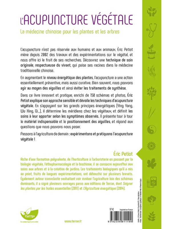L’acupuncture n’est pas réservée aux humains et aux animaux. Éric Petiot mène depuis 2002 des travaux et des expérimentations sur le végétal, et nous offre ici le fruit de ses recherches. Découvrez une technique de soin originale, respectueuse du vivant, qui puise ses racines dans la médecine tradit Voir plus
