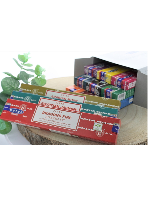 Assortiment d'encens Satya comprenant : 1 x Satya Purification de l'Aura 15 g, 1 x Satya Bénédiction de Bouddha 15 g, 1 x Satya Chakra 15 g, 1 x Satya Musc arabe 15 g, 1 x Satya Jasmin égyptien 15 g, 1 x Satya Lavande 15 g, 1 x Satya Rose 15 g, 1 x Satya Patchouli 15 g, 1 x Satya Sang de Dragon 15 g Voir plus