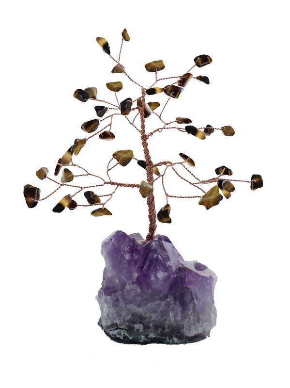 Arbre du Bonheur finement orné de pierres d'Oeil de Tigre montées sur un tronc en cuivre - Arbre du Bonheur composé de 15 branches, de 45 pierres percées en Oeil de Tigre, d'un tronc en fil de cuivre et d'un socle en druse d'Améthyste. L'Oeil de Tigre est une grande pierre de protection, elle crée autour de soi un miroir qui renvoie les énergies négatives à leur origine. Elle contre les mauvaises pensées des personnes envieuses. Aide à identifier nos besoins et nos préférences tant dans nos choix de vie que dans nos relations. L'Arbre du Bonheur est le symbole de la vie, du lien entre la terre et l'infini céleste. Au-delà de son aspect décoratif, il aide au renouvellement des énergies d'un lieu.
