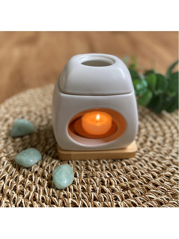 Brûle-parfum en céramique blanche sur socle en bois de forme arrondie