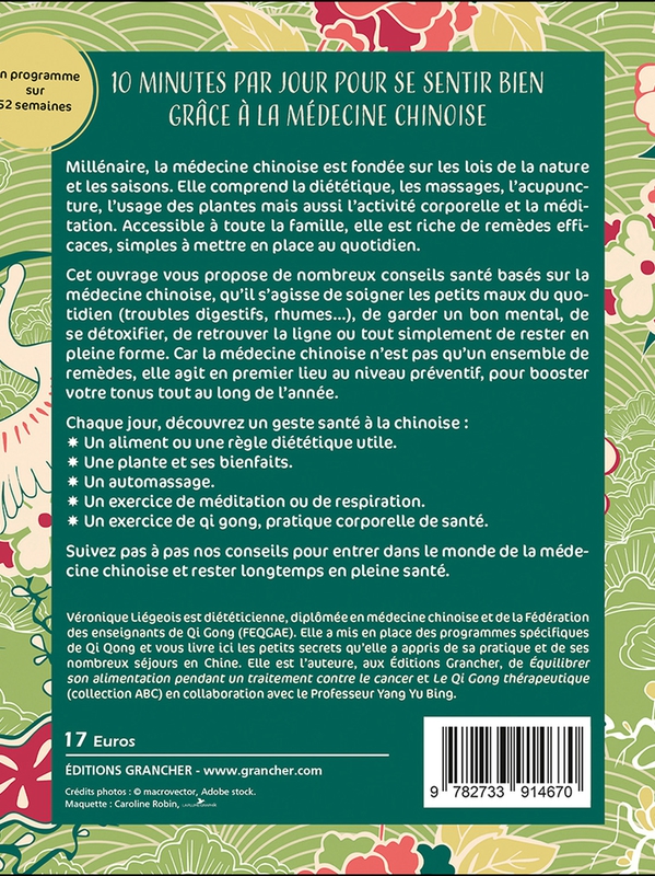 Cet ouvrage vous propose de nombreux conseils santé basés sur la médecine chinoise, qu’il s’agisse de soigner les petits maux du quotidien (troubles digestifs, rhumes…), de garder un bon mental, de se détoxifier, de retrouver la ligne ou tout simplement de rester en pleine forme. Car la médecine chi Voir plus