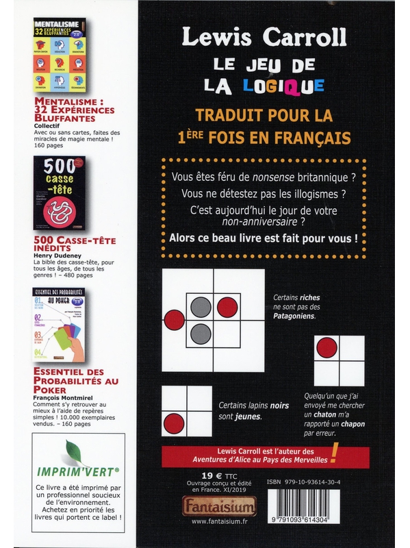 Ce livre est plus qu’un livre. C’est aussi un jeu ! Il est fourni avec des éléments à découper dans le rabat. Lewis Carroll, l’auteur d’''Alice au pays des Merveilles'', était aussi un logisticien de haute volée. Et quand on pousse la logique dans ses derniers retranchements, on arrive à des illogis