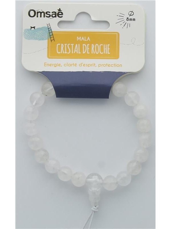 Bracelet mala en pierre naturelle. Fil élastique blanc. Composition du fil : polyester et caoutchouc. Diamètre du bracelet : 6 cm. Diamètre des perles : 22 perles de 0,8 cm et 1 perle de tête de 1 cm avec connecteur.