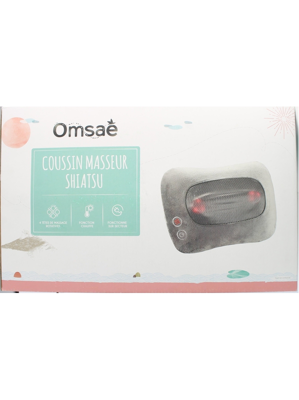 Coussin masseur chauffant électrique. 4 têtes de massage rotatives chauffantes et bidirectionnelles. Arrêt automatique toutes les 15 minutes. Housse en tissu maillé en micro-fibres, déhoussable et lavable en machine. Fonctionne sur secteur avec un adaptateur DC 12V 24W inclus. Dimensions de l'appareil : 35 x 25 x 10 cm. Modèle C43-FM003A. Mode d'emploi à l'intérieur. Télécommande fournie. Garantie 2 ans.
