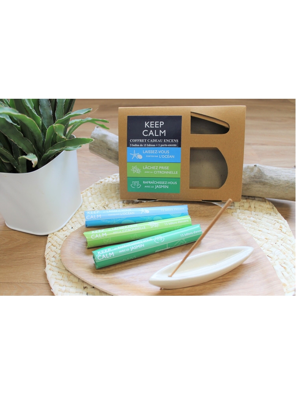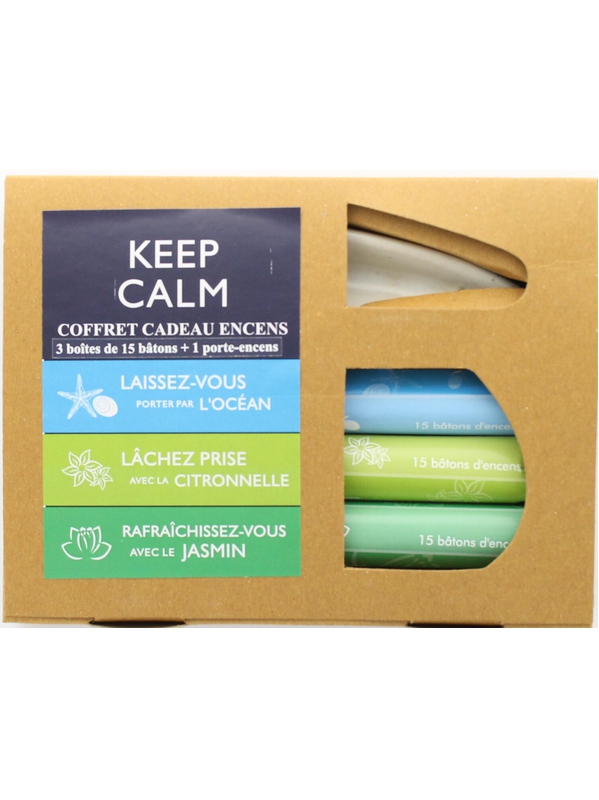 Coffret d'encens composé de trois fragrances de bâtonnets qui favorisent la respiration et la purification et d'un porte-encens en céramique. Ce coffret contient les encens : KEEP CALM et laissez-vous porter par l'océan, KEEP CALM et lâchez prise avec la citronnelle, KEEP CALM et rafraîchissez-vous avec le jasmin.