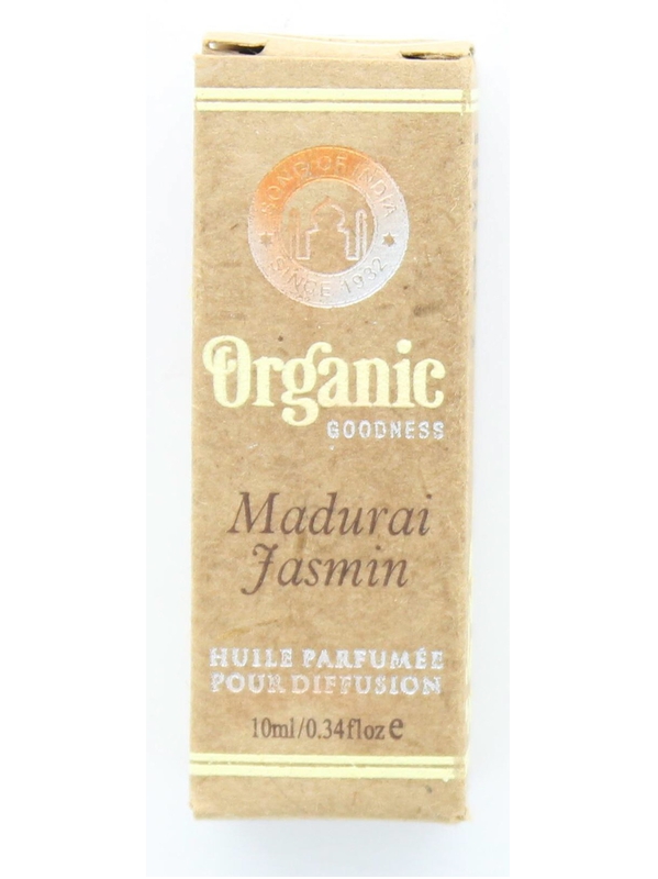 Huile d'arôme biologique de jasmin. Bouteille en verre couleur ambre. Contenance : 10 ml. Fabriqué en Inde.