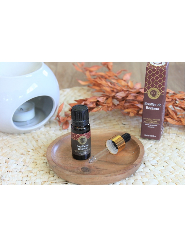Complexe d'huiles essentielles pour diffusion. Ravir ses sens de joie et de bonheur d'une simple bouffée de cette fragrance dont les notes douces vont améliorer son humeur.