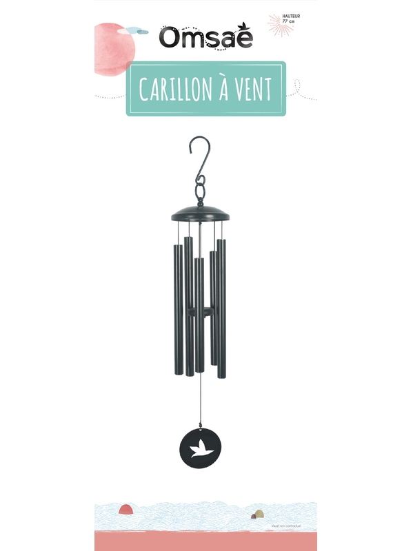 Carillon à vent avec 5 tubes motif oiseau. Notes : Si – Do – Ré – Fa – Sol. Crochet en S en aluminium. Crochet anneau en acier inoxydable. Capot supérieur noir, tubes et anneau noir en aluminium. Partie basse en acrylique. Cordes en nylon. Dimensions : 14,5 x 14,5 x 77 cm. Utilisation en intérieur et en extérieur.