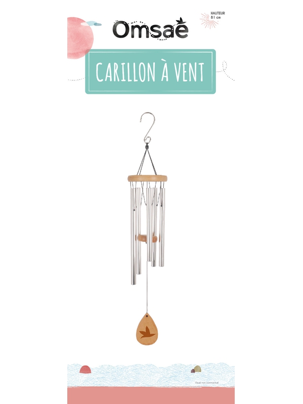 Carillon à vent avec 5 tubes motif oiseau. Notes : Do – Ré – Fa – Sol – SI. Crochet en S et tubes en aluminium. Capot supérieur rond, rondelle et partie basse en bois de frêne. Cordes en nylon. Dimensions : 13,5 x 13,5 x 81 cm. Utilisation en intérieur et en extérieur.
