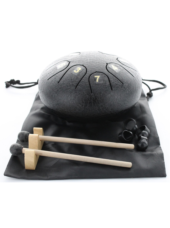 Tongue drum noir en acier inoxydable. 8 notes : Do - Ré - Mi - Fa - Sol - La - Si - Do majeur. Diamètre : environ 15 cm. 2 maillets en bois avec boule en caoutchouc. Longueur : 14,5 cm. Housse noire de protection et transport fournie.