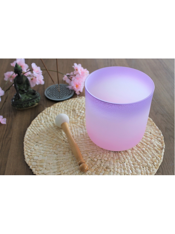 Objet étonnant par l'ambiance sonore qu'il produit, le son doux et profond de ce bol chantant en cristal permet de faire du bien au coeur, au corps et à l’esprit lors des séances de méditation. Les vibrations qu'il libère rééquilibrent les fréquences de chacun et favorisent la détente. Avec sa composition en cristal de quartz, ou sable de silice, il suffit de faire chanter le bol pour que le silicium et l'oxygène qui se trouvent en chacun de nous résonnent. Une connexion immédiate avec le corps se crée grâce aux notes pures et cristallines. Élégamment coloré de rose et de violet, il rééquilibrera les chakras couronne et troisième oeil, et saura séduire par son esthétisme.