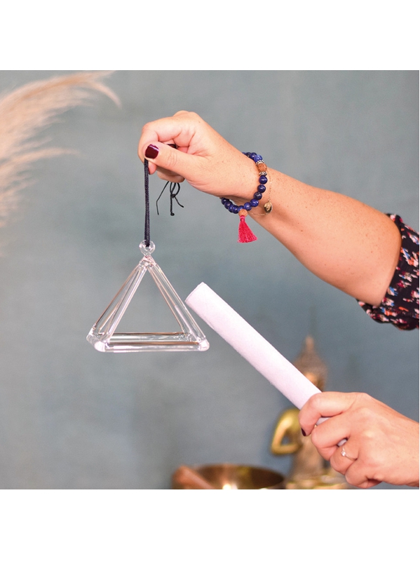 Suspendre la pyramide ou la tenir à la main. A l'aide du maillet, frapper délicatement les différentes parties de la pyramide : sa base et ses arêtes. Pour un son plus riche et chantant, faire tourner la pyramide en la frappant.