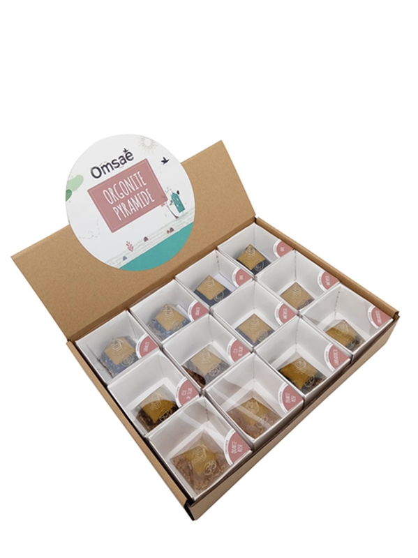 Boîte individuelle avec une orgonite en forme de pyramide en pierre naturelle et d'une médaille finition dorée : améthyste au symbole fleur de vie, labradorite au symbole arbre de vie, oeil de tigre au symbole pentacle ou onyx au symbole lune. C'est l'assemblage d'éléments fondamentaux comme les minéraux et les particules de métal qui donnent à l'orgonite ses caractéristiques exceptionnelles. Véritable filtre à ondes, cette pyramide capte les énergies du cosmos, les amplifie et les diffuse.