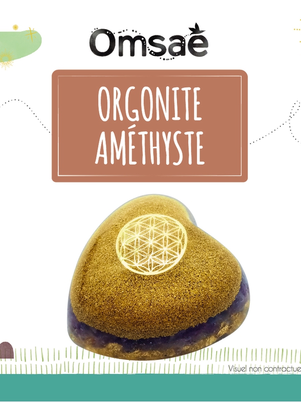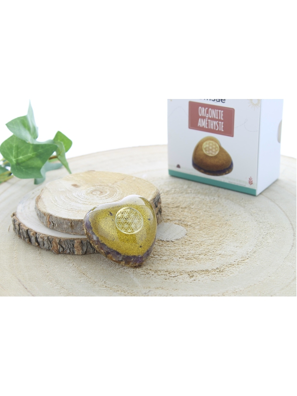 Orgonite en forme de cœur en pierre naturelle d'améthyste et d'une médaille finition dorée au symbole fleur de vie. C'est l'assemblage d'éléments fond Voir plus