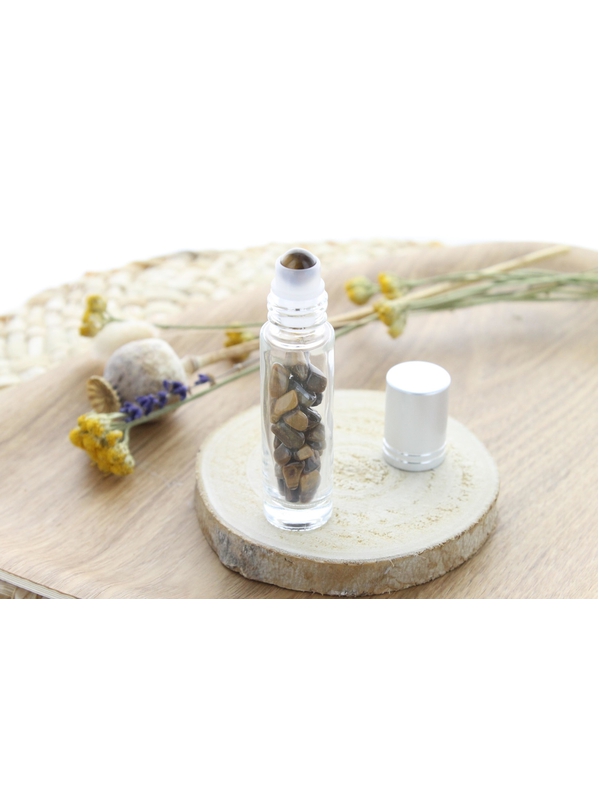 Roll-on composé d'un flacon en verre et de pierres naturelles d'oeil de tigre. La bille rotative en pierre permet une application local