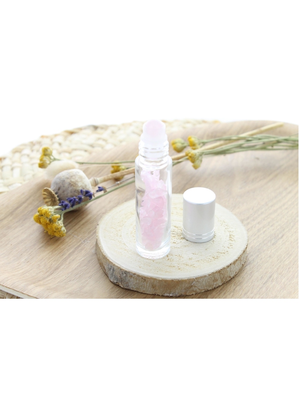 Roll-on composé d'un flacon en verre et de pierres naturelles de quartz rose. La bille rotative en pierre permet une application locali