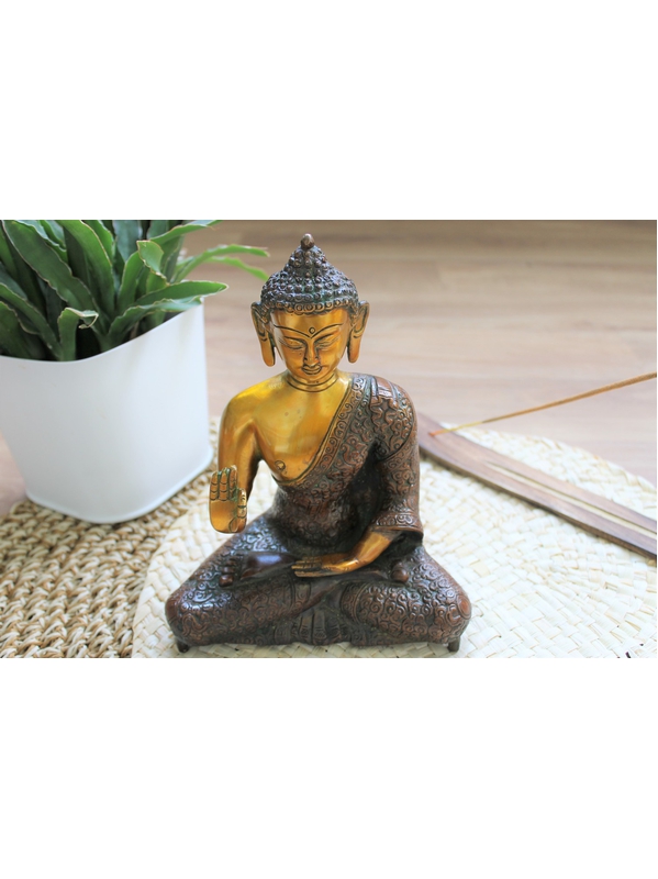 Statuette Bouddha Abhaya mudra en laiton finition orange antique. Dimensions : 16,3 x 20 x 9 cm. Utilisation en intérieur uniquement.