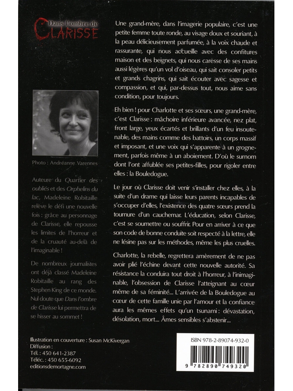 Une grand-mère, dans l’imagerie populaire, c’est une petite femme toute ronde, au visage doux et souriant, à la voix chaude et rassurante, qui sait consoler petits et grands chagrins, écouter avec sagesse et compassion, et qui, par-dessus tout, nous aime sans condition, pour toujours. Eh bien ! Pour Charlotte et ses sœurs, une grand-mère, c’est Clarisse : mâchoire inférieure avancée, nez plat, front large, yeux écartés et brillants d’un feu insoutenable, des mains comme des battoirs, un corps massif et imposant, et une voix qui s’apparente à un grognement, parfois même à un aboiement. D’où le surnom dont l’ont affublée ses petites-filles : la Bouledogue. Le jour où Clarisse doit venir s’installer chez elles, à la suite d’un drame qui laisse leurs parents incapables de s’occuper d’elles, l’existence des quatre sœurs prend la tournure d’un cauchemar. L’éducation, selon Clarisse, c’est se soumettre ou souffrir. Pour en arriver à ce que son code de bonne conduite soit respecté à la lettre, elle ne lésine pas sur les méthodes, même les plus cruelles. Charlotte, la rebelle, regrettera amèrement de ne pas avoir plié l’échine devant cette nouvelle autorité. Sa résistance la conduira tout droit à l’horreur, à l’inimaginable...Robitaille Madeleine Voir moins