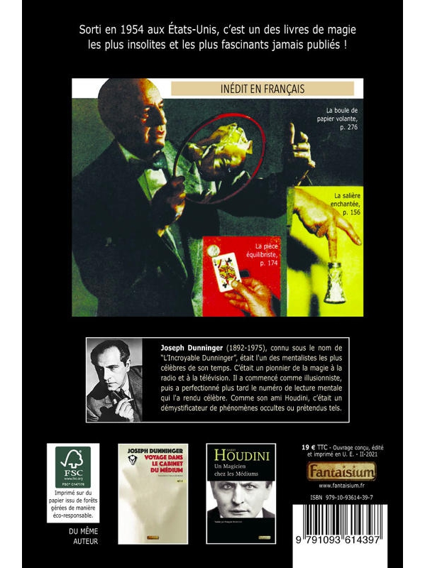 Joseph Dunninger (1892-1975) était un magicien américain. Il a été parmi les premiers à se produire à la radio puis à la télévision. Proche d’Houdini, il a prouvé après la mort de celui-ci qu’il en était le digne héritier. Dunninger propose ici 100 tours de magie qu’Houdini a inventés, exécutés ou i