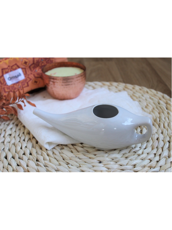Pot Neti en céramique de couleur blanche avec un bec verseur long et fin.  Accessoire indispensable en Ayurveda pour le rituel matinal appelé Dinacharya, le pot neti permet Voir plus