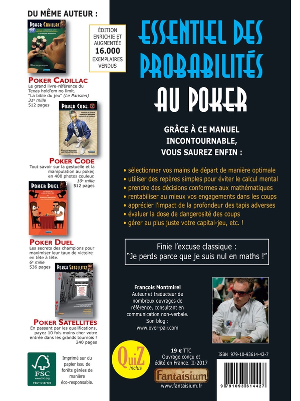 Finie l’excuse classique : “Je perds au poker parce que je suis nul en maths !” Grâce à ce manuel devenu incontournable, vous saurez enfin : sélectionner vos mains de départ de manière optimale , utiliser des repères simples pour éviter le calcul mental , prendre des décisions conformes aux mathématiques , rentabiliser au mieux vos engagements dans les coups , apprécier l’impact de la profondeur des tapis adverses , évaluer la dose de dangerosité des coups , gérer au plus juste votre capital-jeu, etc. ! Cette nouvelle version tout en couleur contient plus d’exemples, des explications plus pédagogiques, des concepts plus nombreux… et aussi plus de pages ! (16000 exemplaires vendus).Montmirel François Voir moins
