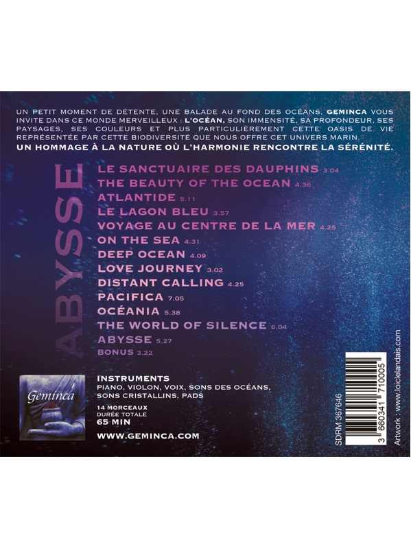 Un petit moment de détente, une balade au fond des océans, Geminca vous invite dans ce monde merveilleux : l'océan, son immensité, sa profondeur, ses paysages, ses couleurs et plus particulièrement cette oasis de vie représentée par cette biodiversité que nous offre cet univers marin. Un hommage à la nature ou l’harmonie rencontre la sérénité. La musique donne une âme à nos cœurs et des ailes à la pensée.Geminca Voir moins