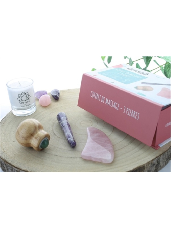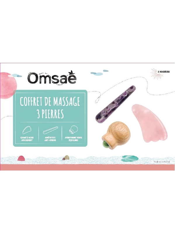 Coffret de massage lithothérapie pour le corps en quartz rose, améthyste et aventurine verte Omsaé