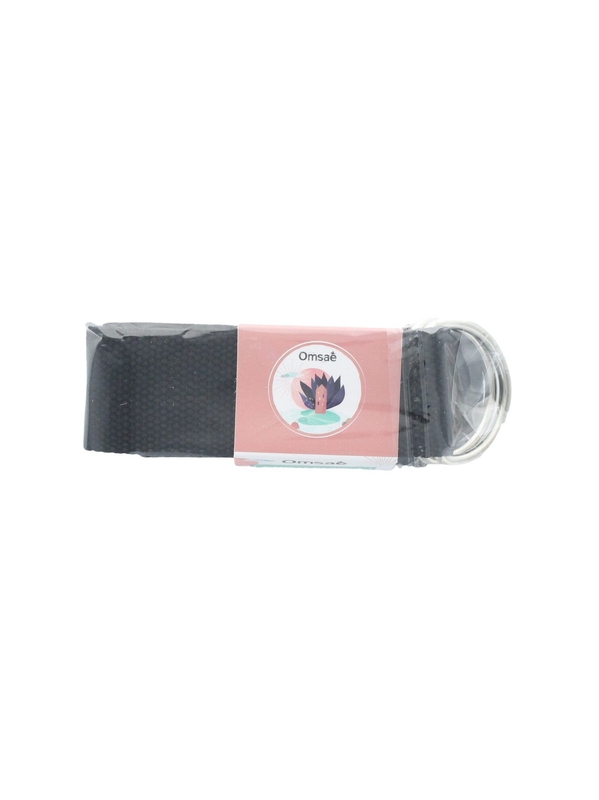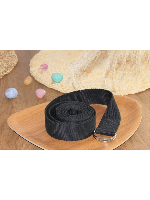 Sangle de yoga composée de 80% de coton, 20% de polyester et d'une boucle en métal. Dimensions : 2 m x 4 cm.