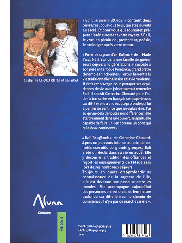 « Bali, un chemin d’Amour » contient deux ouvrages, pour vous tous, qui êtes ouverts au sacré. Et pour vous qui souhaitez préparer intérieurement votre voyage à Bali, le vivre en plénitude, profondeur, poésie, le prolonger après votre retour. « Perles de sagesse d’un balinais » de I Made Yasa. Né à Bali dans une famille de guérisseurs depuis 5 générations, il succède à son père en tant que Pemanku, grand prêtre de temples hindouistes. Il est un lien entre la vie traditionnelle balinaise et la vie moderne. Il écrit cet ouvrage pour partager ses expériences de vie avec joie et surtout remercier Bali. Il choisit Catherine Chouard pour l’aider à transcrire en français ses expériences car dit-il : « Elle a une écoute profonde qui lui a permis de sentir ce que je voulais dire. J’ai su qu’au-delà de toutes nos différences, elle était vraiment dans une ouverture spirituelle capable de faire un lien comme un pont qui relie deux continents ». « Bali, île offrande », de Catherine Chouard. Après un parcours intense au sein de comités exécutifs de grands groupes, Bali a été un déclic dans sa vie en 2008. Elle y découvre la tradition des offrandes et reçoit les enseignements de I Made Yasa lors de ses nombreux séjours. Toujours en quête d’approfondir sa connaissance de la sagesse de l’île, elle est devenue une passeuse entre les mondes. Elle accompagne aujourd’hui des personnes en recherche de leur nature profonde car dit-elle : « Sur le chemin de conscience, il n’y a pas de marche arrière ».I Made Yasa,Chouard Catherine Voir moins