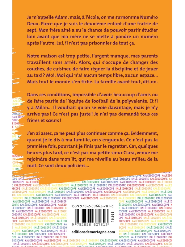 Je m’appelle Adam, mais, à l’école, on me surnomme Numéro Deux. Parce que je suis le deuxième enfant d’une fratrie de sept. Mon frère aîné a eu la chance de pouvoir partir étudier loin avant que ma mère ne se mette à pondre un numéro après l’autre. Lui, il n’est pas prisonnier de tout ça. Notre maison est trop petite, l’argent manque, mes parents travaillent sans arrêt. Alors, qui s’occupe de changer des couches, de cuisiner, de faire régner la discipline et de jouer au taxi ? Moi. Moi qui n’ai aucun temps libre, aucun espace… Mais tout le monde s’en fiche. La famille avant tout, dit-on. Dans ces conditions, impossible d’avoir beaucoup d’amis ou de faire partie de l’équipe de football de la polyvalente. Et il y a Milan… Il voudrait qu’on se voie davantage, mais je n’y arrive pas ! Ce n’est pas juste ! Je n’ai pas demandé tous ces frères et sœurs ! J’en ai assez, ça ne peut plus continuer comme ça. Évidemment, quand je le dis à ma famille, on s’engueule. Ce n’est pas la première fois, pourtant je finis par le regretter. Car, quelques heures plus tard, ce n’est pas ma petite sœur Clara, venue me rejoindre dans mon lit, qui me réveille au beau milieu de la nuit. Ce sont deux policiers...Champagne Samuel Voir moins