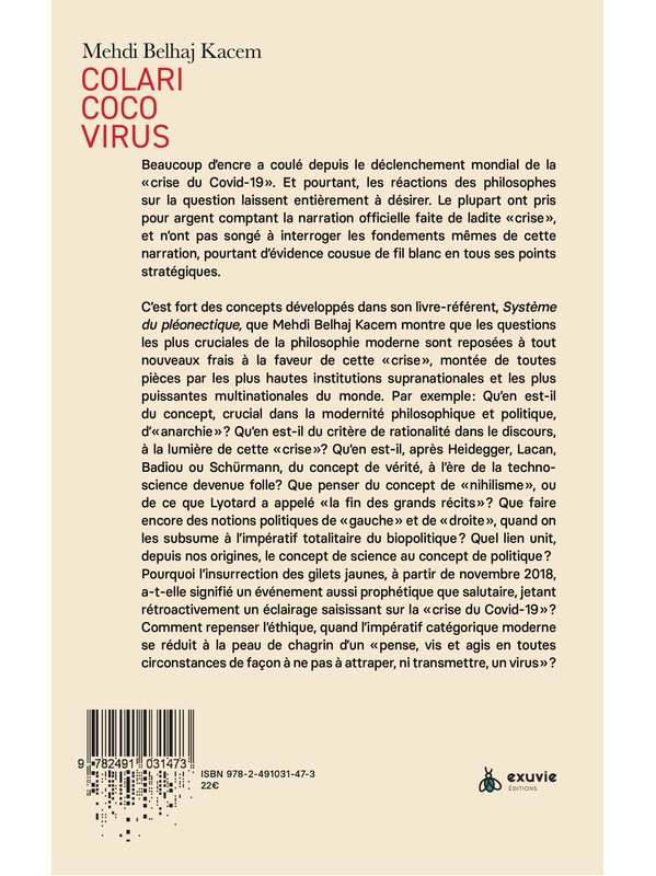 Ce livre a été écrit avec la volonté de dresser un constat sur la crise du Covid-19 en adoptant un regard à la fois philosophique et politique. En effet, cette crise a bouleversé le monde entier dans ses fondements et comme jamais auparavant. Le livre se compose en 3 parties : d’abord, une lettre en réponse à une anonyme, une lettre ouverte au maire de son village, qui a vite été rendue publique et qui a fait le buzz sur internet par des millions de vues en quelques jours. La dernière partie est un entretien avec Daniel Tutt qui a fait beaucoup parlé dans le monde intellectuel aux États-Unis.Belhaj Kacem Mehdi Voir moins
