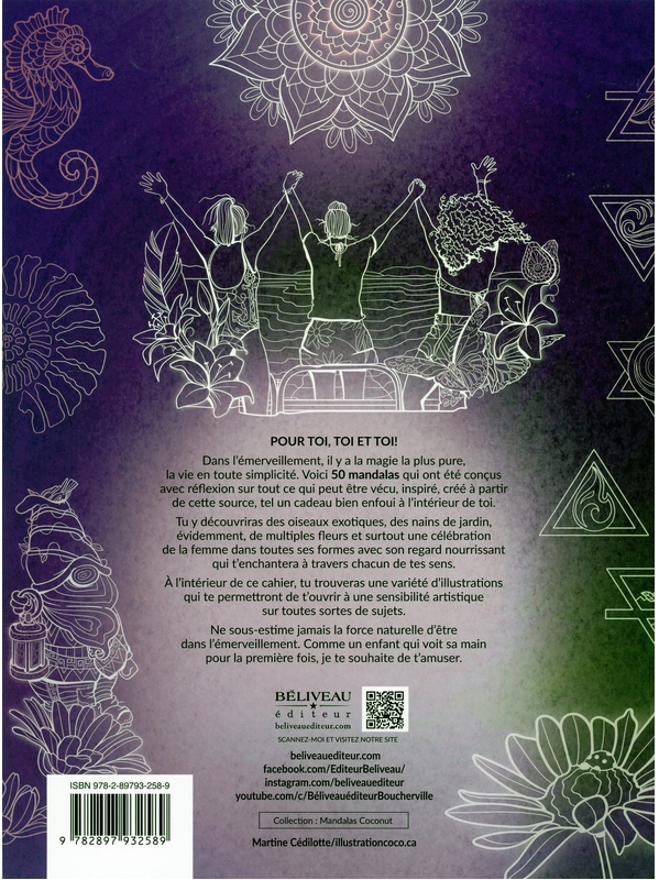 Dans l’émerveillement, il y a la magie la plus pure, la vie en toute simplicité. Voici 50 mandalas qui ont été conçus avec réflexion sur tout ce qui peut être vécu, inspiré, créé à partir de cette source, tel un cadeau bien enfoui à l’intérieur de toi. Tu y découvriras des oiseaux exotiques, des nai