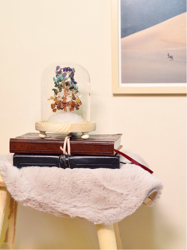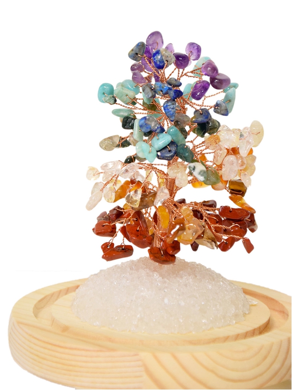 Finement orné de pierres naturelles aux couleurs des 7 Chakras, cet arbre du bonheur saura s'intégrer harmonieusement dans votre intérieur grâce à son design équilibré et sa mise en beauté sous une cloche en verre. L'arbre du bonheur est le symbole de la vie, du lien entre la terre et l'infini céleste. Ces 7 pierres ont été sélectionnées en fonction de leur couleur et de leurs bienfaits pour vibrer en harmonie avec vos chakras. Elles vous aideront à identifier vos blocages et à vous en libérer. Elles équilibreront vos centres énergétiques et auront un impact positif sur votre bien-être, vos émotions et vos pensées.