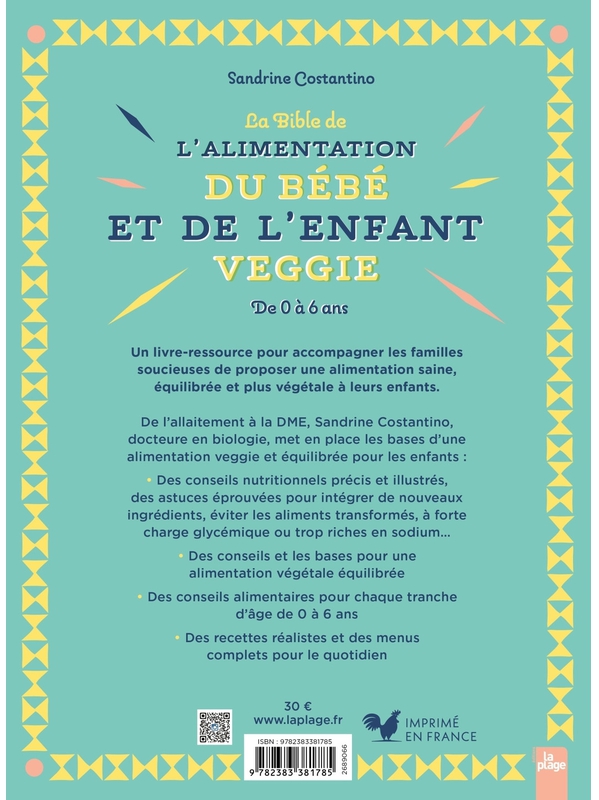 La bible de l'alimentation du bébé et de l'enfant veggie de 0 à 6 ans De l’allaitement à la DME, Sandrine Costantino, docteure en biologie, met en place les bases d’une alimentation équilibrée, saine et veggie pour les enfants de 0 à 6 ans avec des conseils nutritionnels précis, des recettes veggies