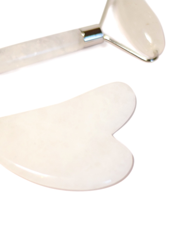 Coffret de massage composé d'un rouleau finition argentée et d'un gua sha en pierre naturelle de cristal de roche. Hérités des rituels de soin et de beauté c