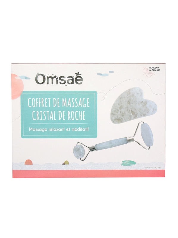 Coffret de massage composé d'un rouleau finition argentée et d'un gua sha en pierre naturelle de cristal de roche. Hérités des rituels de soin et de beauté chinois traditionnels, ce rouleau et ce gua sha permettent d'améliorer l'apparence de la peau et de se libérer des tensions par un massage alliant douceur et tonicité. Le rouleau est doté de deux pierres de tailles différentes, idéales pour masser toutes les zones du visage. Le gua sha viendra sculpter et lifter les traits grâce à sa forme spécifique, pensée pour épouser les lignes du visage. Le cristal de roche, pierre propice à la méditation, viendra renforcer les bienfaits du massage.