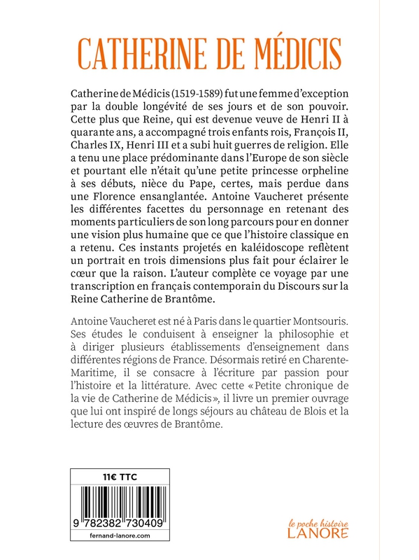 Catherine de Médicis (1519-1589) fut une femme d’exception par la double longévité de ses jours et de son pouvoir. Cette plus que Reine, qui est devenue veuve de Henri II à quarante ans, a accompagné trois enfants rois, François II, Charles IX, Henri III et a subi huit guerres de religion. Elle a tenu une place prédominante dans l’Europe de son siècle et pourtant elle n’était qu’une petite princesse orpheline à ses débuts, nièce du Pape, certes, mais perdue dans une Florence ensanglantée. Antoine Vaucheret présente les différentes facettes du personnage en retenant des moments particuliers de son long parcours pour en donner une vision plus humaine que ce que l’histoire classique en a retenu. Ces instants projetés en kaléidoscope reflètent un portrait en trois dimensions plus fait pour éclairer le cœur que la raison. L’auteur complète ce voyage par une transcription en français contemporain du Discours sur la Reine Catherine de Brantôme.Vaucheret Antoine Voir moins