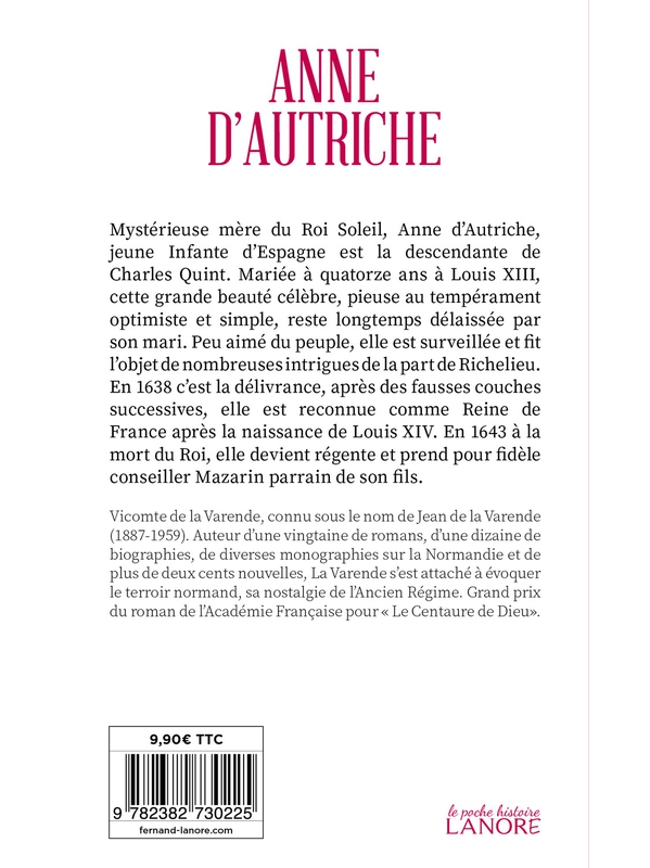 Mystérieuse mère du Roi Soleil, Anne d’Autriche, jeune Infante d’Espagne est la descendante de Charles Quint. Mariée à quatorze ans à Louis XIII, cette grande beauté célèbre, pieuse au tempérament optimiste et simple, reste longtemps délaissée par son mari. Peu aimé du peuple, elle est surveillée et Voir plus