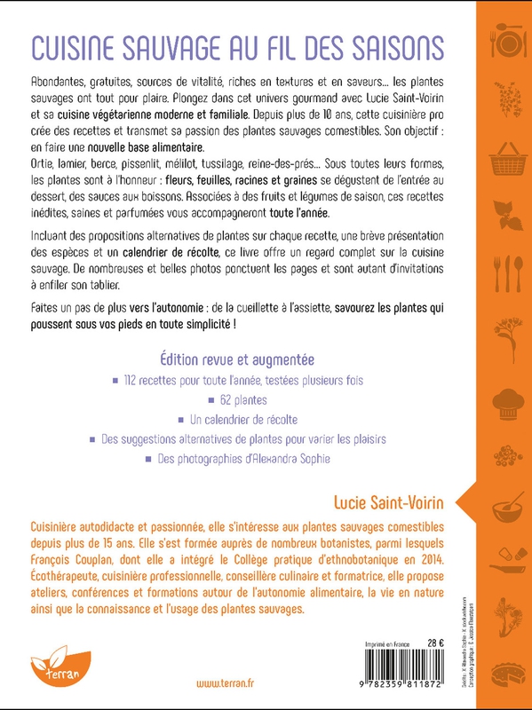 Abondantes, gratuites, sources de vitalité, riches en textures et en saveurs… les plantes sauvages ont tout pour plaire. Plongez dans cet univers gourmand avec Lucie Saint-Voirin et sa cuisine végétarienne moderne et familiale. Depuis plus de 10 ans, cette cuisinière pro crée des recettes et transmet sa passion des plantes sauvages comestibles. Son objectif : en faire une nouvelle base alimentaire. Ortie, lamier, berce, pissenlit, mélilot, reine-des-prés… Sous toutes leurs formes, les plantes sont à l’honneur : fleurs, feuilles, racines et graines se dégustent de l’entrée au dessert, des sauces aux boissons. Associées à des fruits et légumes de saison, ces 112 recettes inédites, saines et parfumées vous accompagneront toute l’année. Incluant des propositions alternatives de plantes sur chaque recette, une brève présentation des 62 espèces et un calendrier de récolte, ce livre offre un regard complet sur la cuisine sauvage. De nombreuses et belles photos ponctuent les pages et sont autant d’invitations à enfiler son tablier. Faites un pas de plus vers l’autonomie : de la cueillette à l’assiette, savourez les plantes qui poussent sous vos pieds en toute simplicité ! Nouvelle édition.Saint-Voirin Lucie Voir moins