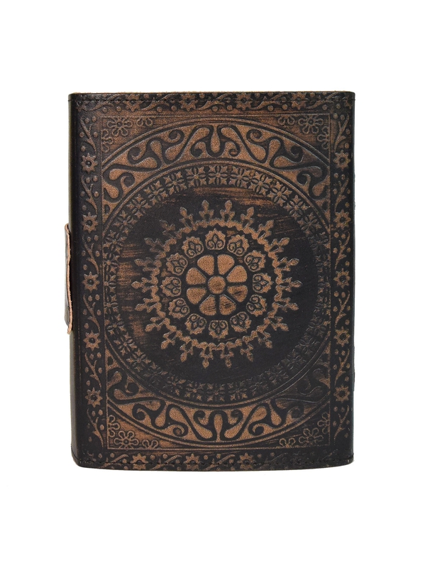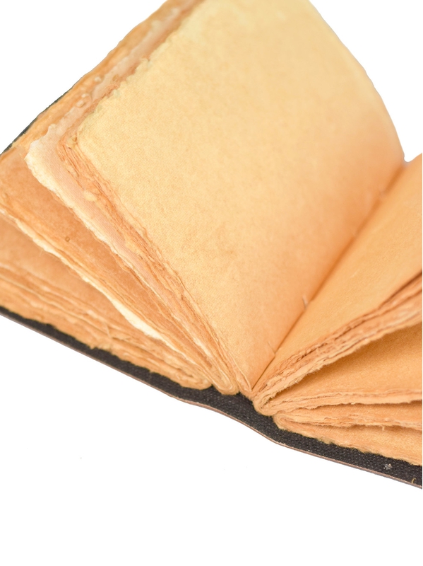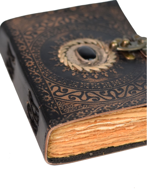Grimoire fabriqué à la main en Inde composé de cuir de buffle, d'une pierre en obsidienne noire et d'un fermoir en métal. Contient environ 100 pages en papier antique fait à la main à partir de matières recyclées.