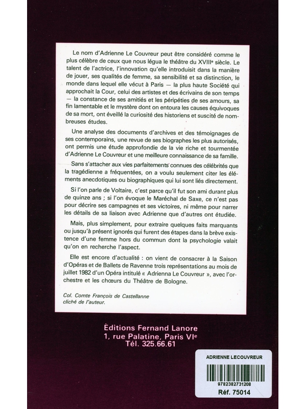 Le nom d'Adrienne Le Couvreur peut être considéré comme le plus célèbre de ceux que nous légua le théâtre du XVIIIe siècle. Le talent de l'actrice, l'innovation qu'elle introduisit dans la manière de jouer, ses qualités de femme, sa sensibilité et sa distinction, le monde dans lequel elle vécut à Pa Voir plus