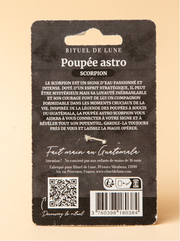Le Scorpion est un signe d'Eau passionné et intense. Doté d'un esprit stratégique, il peut être mystérieux mais sa loyauté inébranlable et son courage font de lui un compagnon formidable dans les moments cruciaux de la vie. Inspirée de la légende des poupées à soucis du Guatemala, la poupée astro Scorpion vous aidera à vous connecter à votre signe et à révéler tout son potentiel. Gardez la toujours près de vous et laissez la magie opérer.