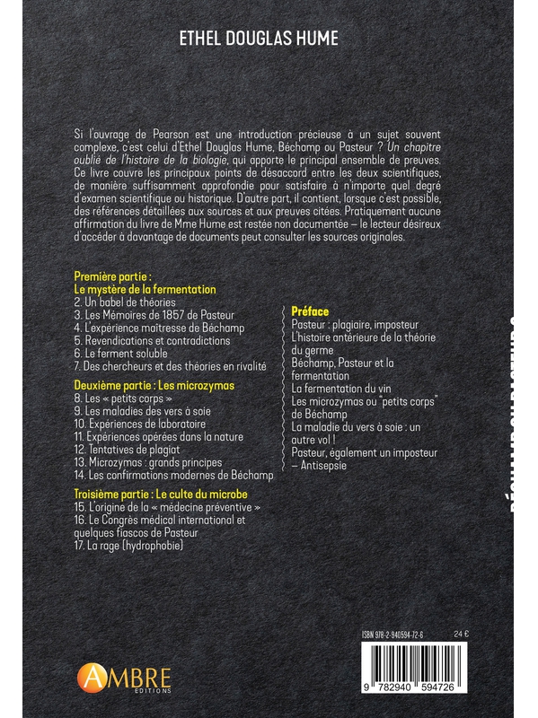 Après une préface précieuse sur un sujet souvent complexe, c’est celui d’Ethel Douglas Hume, « Béchamp ou Pasteur ? », qui apporte le principal ensemble de preuves. Ce livre couvre les principaux points de désaccord entre les deux scientifiques, de manière suffisamment approfondie pour satisfaire à