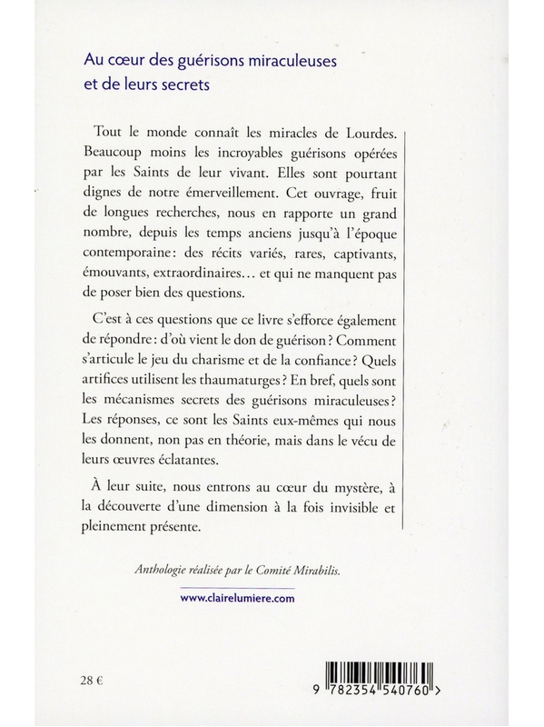 Tout le monde connaît les miracles de Lourdes. Beaucoup moins les incroyables guérisons opérées par les Saints de leur vivant. Elles sont pourtant propres à nous émerveiller. Cet ouvrage, fruit de nombreuses recherches, nous en rapporte près de deux cents, depuis les temps anciens jusqu’à l’époque contemporaine?: des récits captivants, émouvants, extraordinaires… et qui posent bien des questions. C’est à ces questions que nous nous sommes également efforcés de répondre?: d’où vient le don de guérison?? Qui guérit ou ne guérit pas?? Quels sont les mécanismes secrets des miracles?? Les réponses, ce sont les Saints eux-mêmes qui nous les donnent, non pas en théorie, mais dans le vécu de leurs œuvres éclatantes. À leur suite, nous entrons au cœur du mystère, à la découverte d’une dimension à la fois invisible et pleinement présente.Comité Mirabilis Voir moins