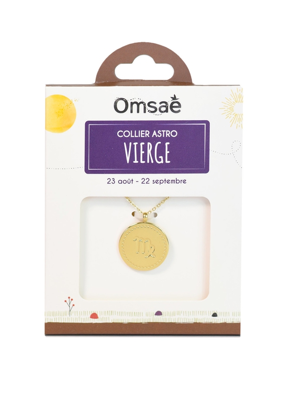 Collier composé d'une médaille gravée et d'une chaîne en acier inoxydable. Médaille gravée au recto et au verso avec le signe et la constellation Vierge. Chaîne ajustable d'une longueur de 40-45 cm.