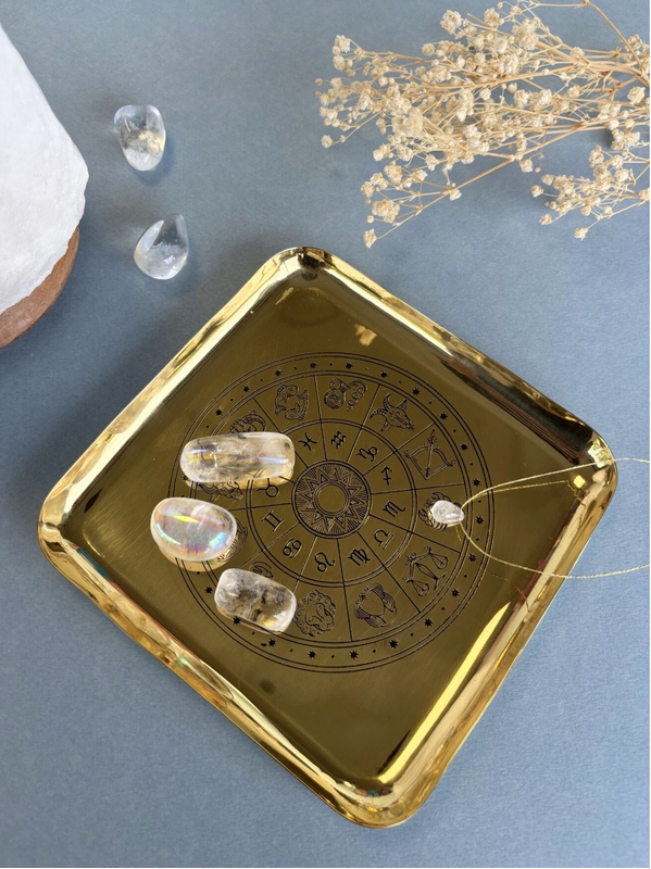 Découvrez ce plateau en laiton orné de la roue du zodiaque finement gravée. Idéal pour ajouter une dimension astrologique à votre espace, il vous permet également de ranger vos pierres naturelles, bijoux ou petits objets précieux.